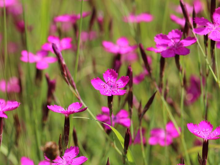 Die pink-farbenen Blüten der Heide-Nelke leuchten dem Spaziergänger schon von weitem entgegen. Sie stehen meist in größeren Herden und werden auch gerne von verschiedenen Schmetterlingen besucht.