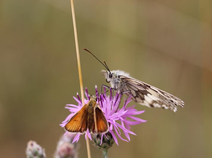Diese beiden Schmetterlinge tragen ihr Aussehen im Namen: Der Dickkopffalter hat einen besonders dicken Kopf, der breiter ist als der Körper. Das Schachbrett, auch Damenbrett genannt, hat schachbrettartig schwarz oder dunkelbraun und weiß gefleckte Flügeloberseiten.