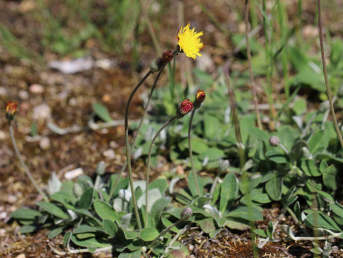 Die borstig behaarten Blättchen des Kleinen Habichtskrauts sehen aus wie Mäuseohren, daher auch der Name Mausöhrchen-Habichtskraut. Es liebt trockene, offene Bodenstellen und breitet sich mit seinen Rosetten zu dichten kleinen Teppichen aus. Die sehr leichten Samen sind „Schirmchenflieger“, werden vom Wind vertragen oder haften im nassen Fell von Tieren.